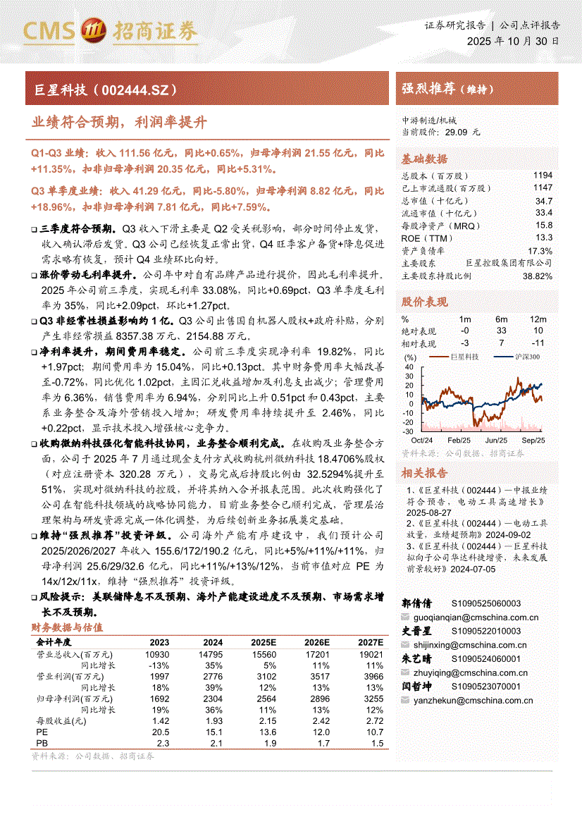 巨星科技:招商证券-巨星科技-002444-业绩符合预期,利润率提升-251030