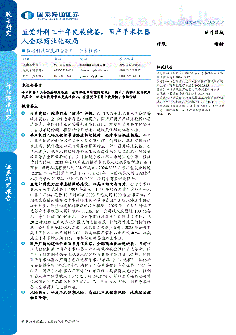 医疗科技行业:国泰海通证券-医疗科技行业深度报告系列:手术机器人,直觉外科三十年发展镜鉴,国产手术机器人全球商业化破局-260404