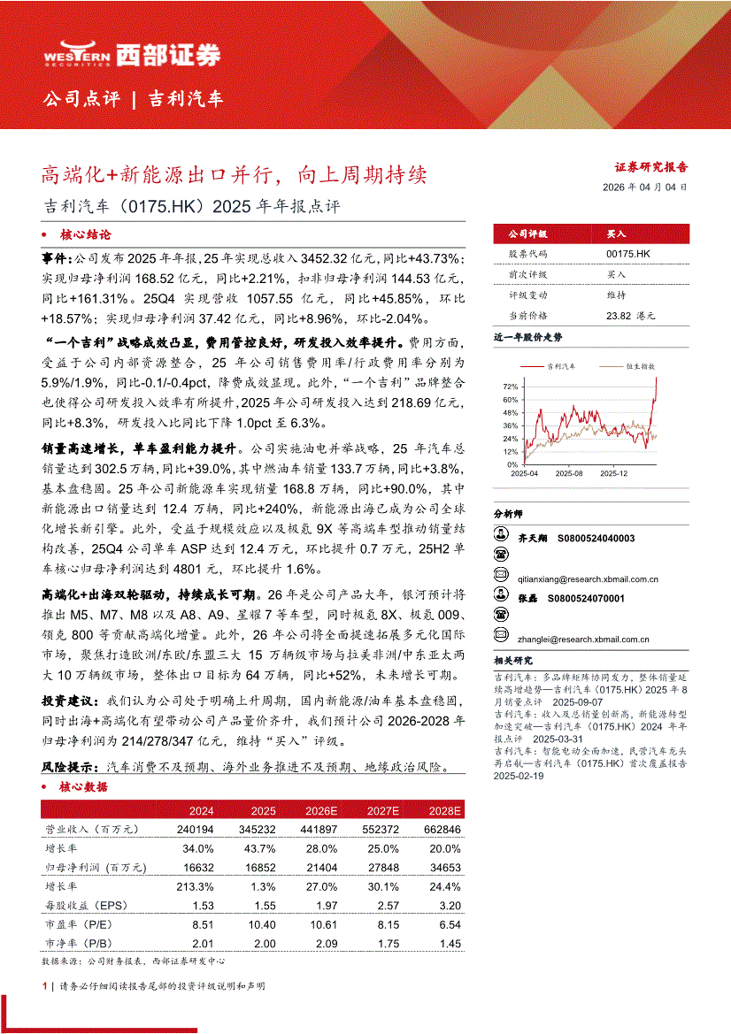 吉利汽车:西部证券-吉利汽车-0175.HK-2025年年报点评:高端化+新能源出口并行,向上周期持续-260404