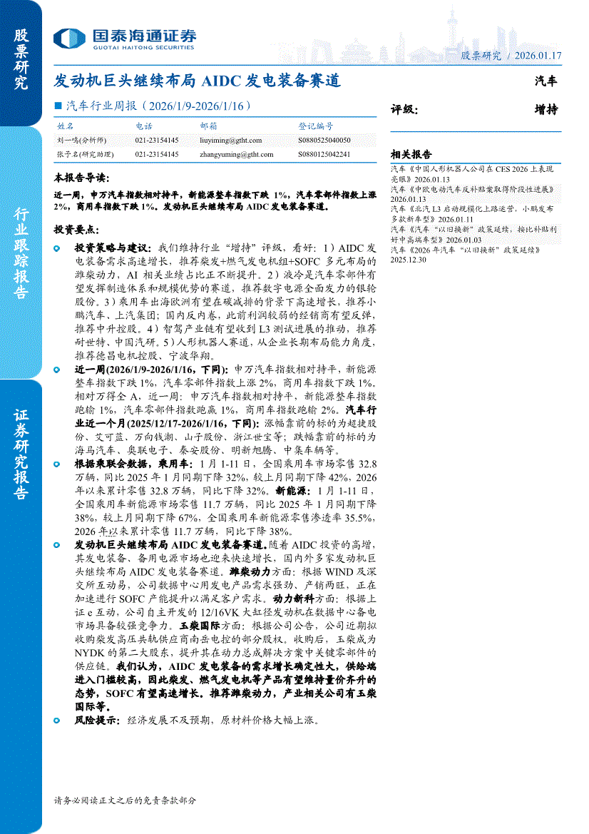 汽车行业:国泰海通证券-汽车行业周报:发动机巨头继续布局AIDC发电装备赛道-260117