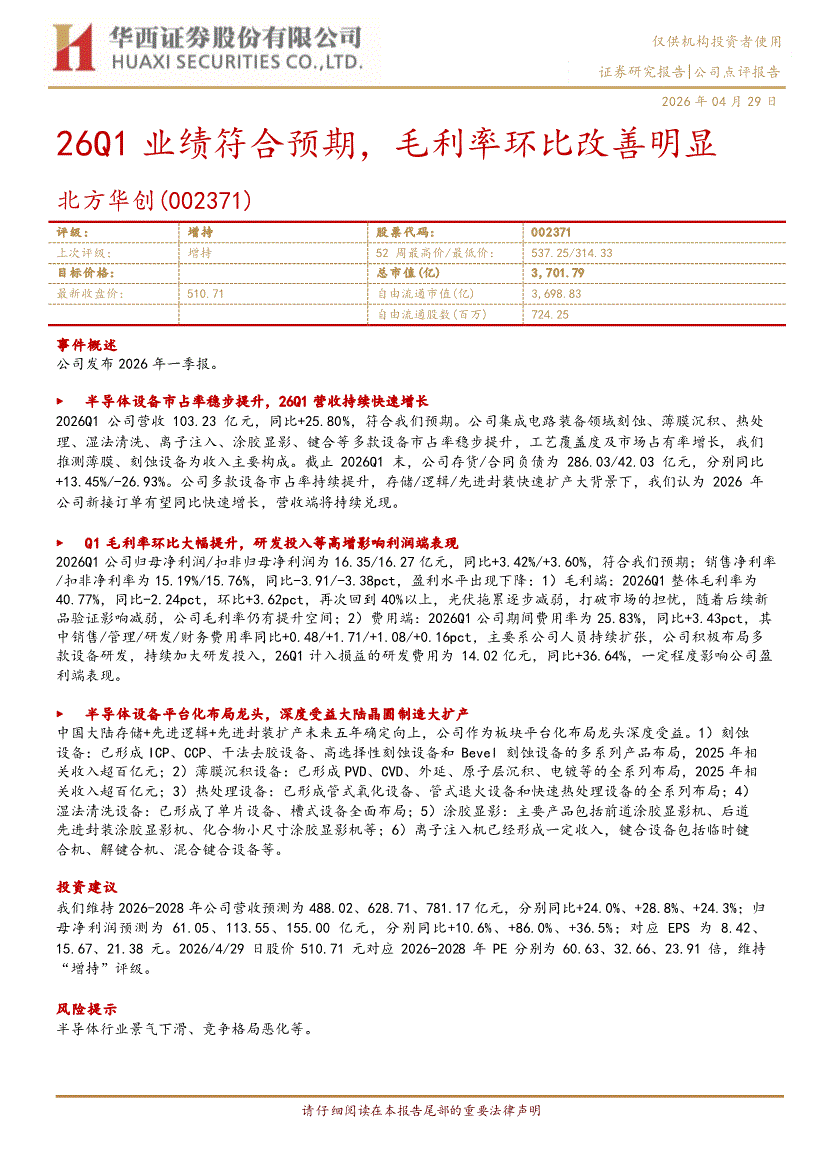 北方华创:华西证券-北方华创-002371-26Q1业绩符合预期,毛利率环比改善明显-260429
