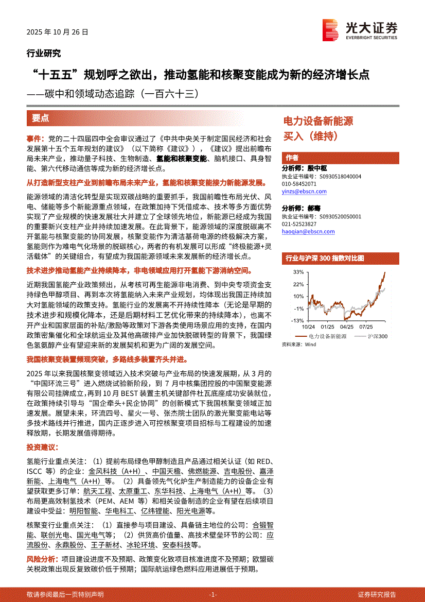 电力设备新能源行业:光大证券-电力设备新能源行业碳中和领域动态追踪(一百六十三):“十五五”规划呼之欲出,推动氢能和核聚变能成为新的经济增长点-251026