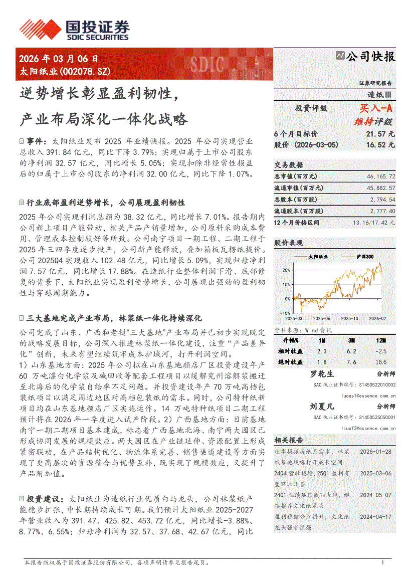 太阳纸业:国投证券-太阳纸业-002078-逆势增长彰显盈利韧性,产业布局深化一体化战略-260306