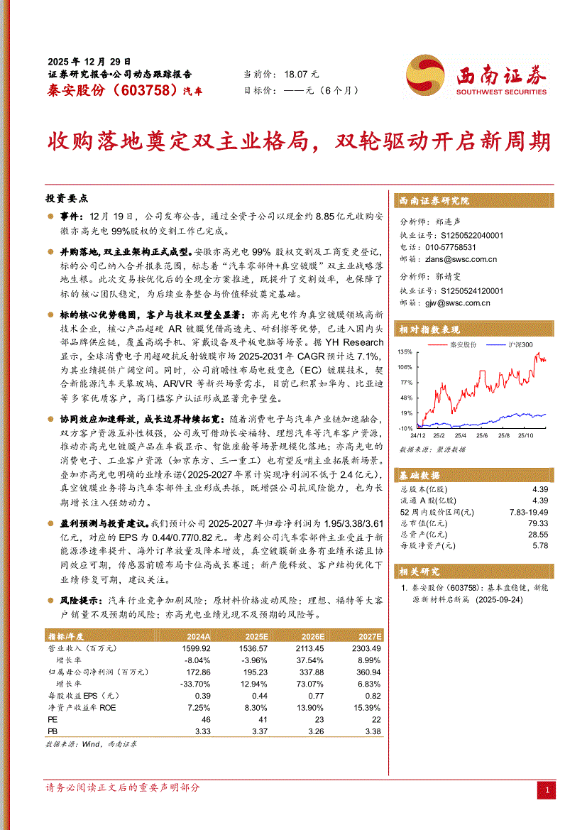 秦安股份:西南证券-秦安股份-603758-收购落地奠定双主业格局,双轮驱动开启新周期-251229