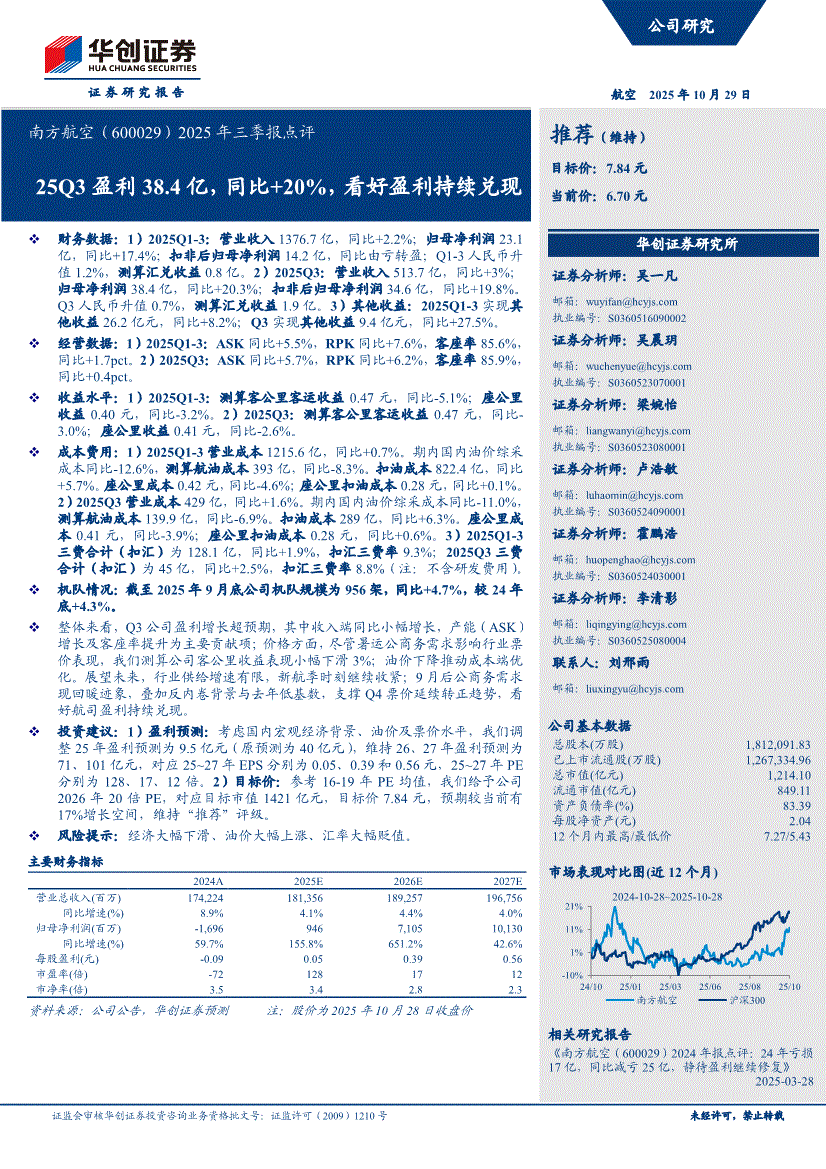 南方航空:华创证券-南方航空-600029-2025年三季报点评:25Q3盈利38.4亿,同比+20%,看好盈利持续兑现-251029