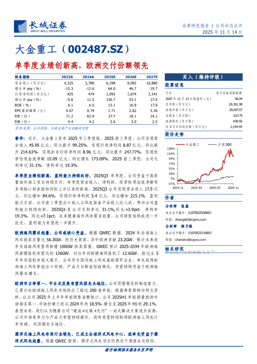 大金重工:长城证券-大金重工-002487-单季度业绩创新高,欧洲交付份额领先-251114