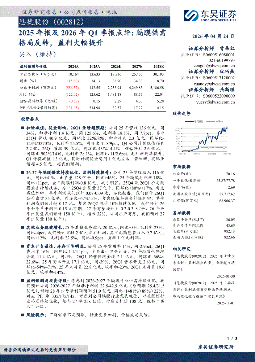 恩捷股份:东吴证券-恩捷股份-002812-2025年报及2026年Q1季报点评:隔膜供需格局反转,盈利大幅提升-260424