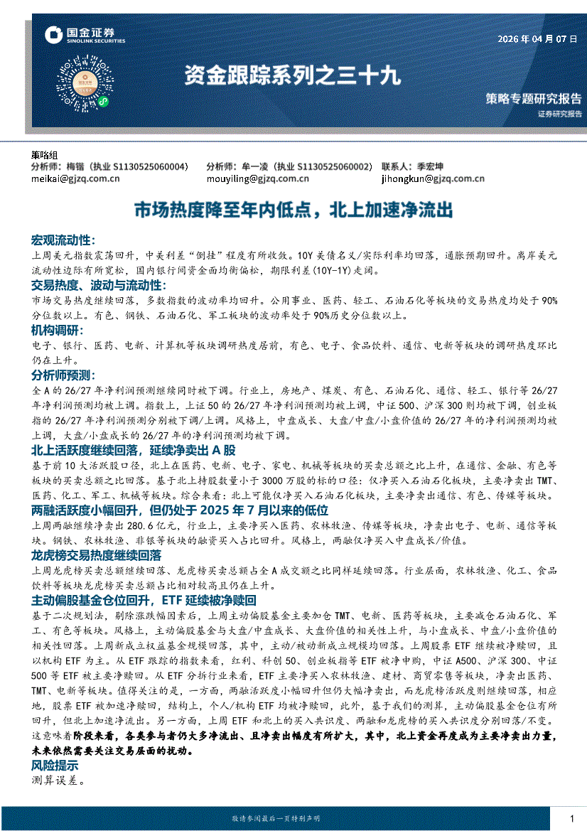 国金证券-资金跟踪系列之三十九:市场热度降至年内低点,北上加速净流出-260407