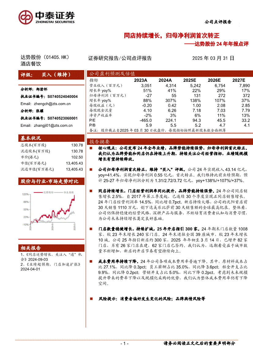 达势股份:中泰证券-达势股份-1405.HK-24年年报点评:同店持续增长,归母净利润首次转正-250331