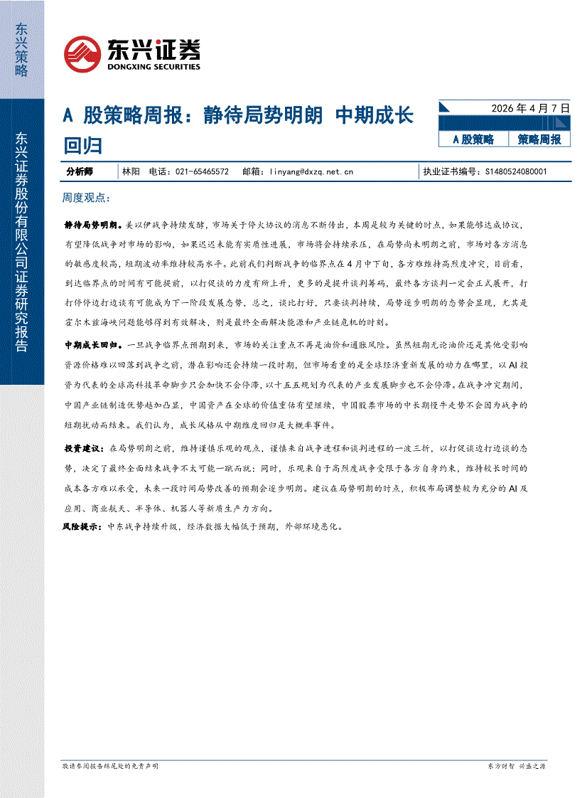 东兴证券-A股策略周报:静待局势明朗中期成长回归-260407