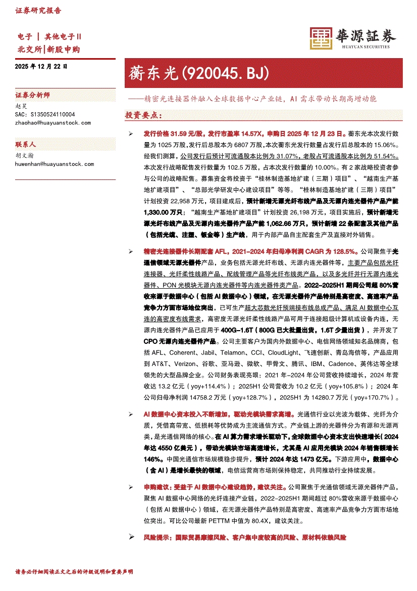 蘅东光:华源证券-蘅东光-920045-精密光连接器件融入全球数据中心产业链,AI需求带动长期高增动能-251222
