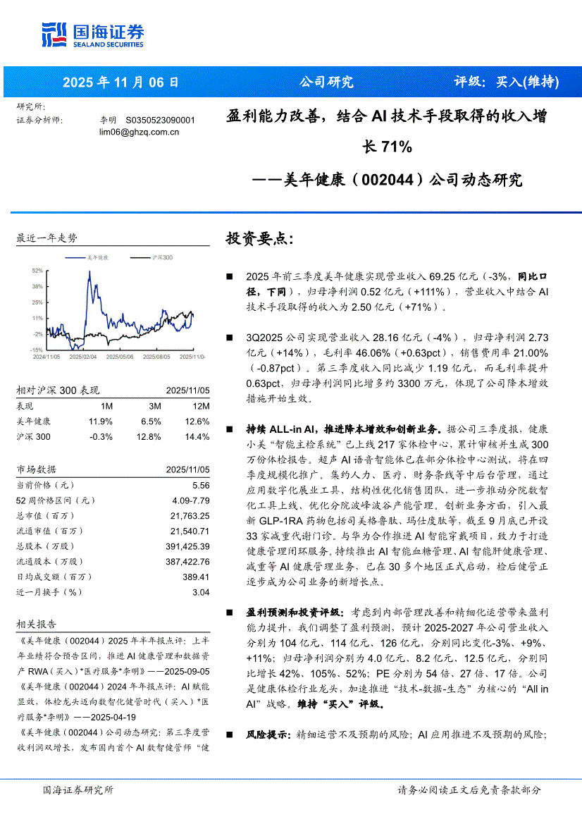 美年健康:国海证券-美年健康-002044-公司动态研究:盈利能力改善,结合AI技术手段取得的收入增长71%-251106