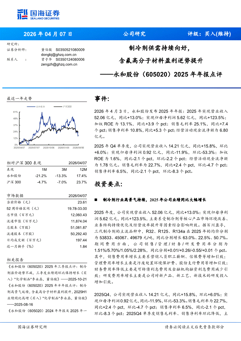 永和股份:国海证券-永和股份-605020-2025年年报点评:制冷剂供需持续向好,含氟高分子材料盈利逆势提升-260407