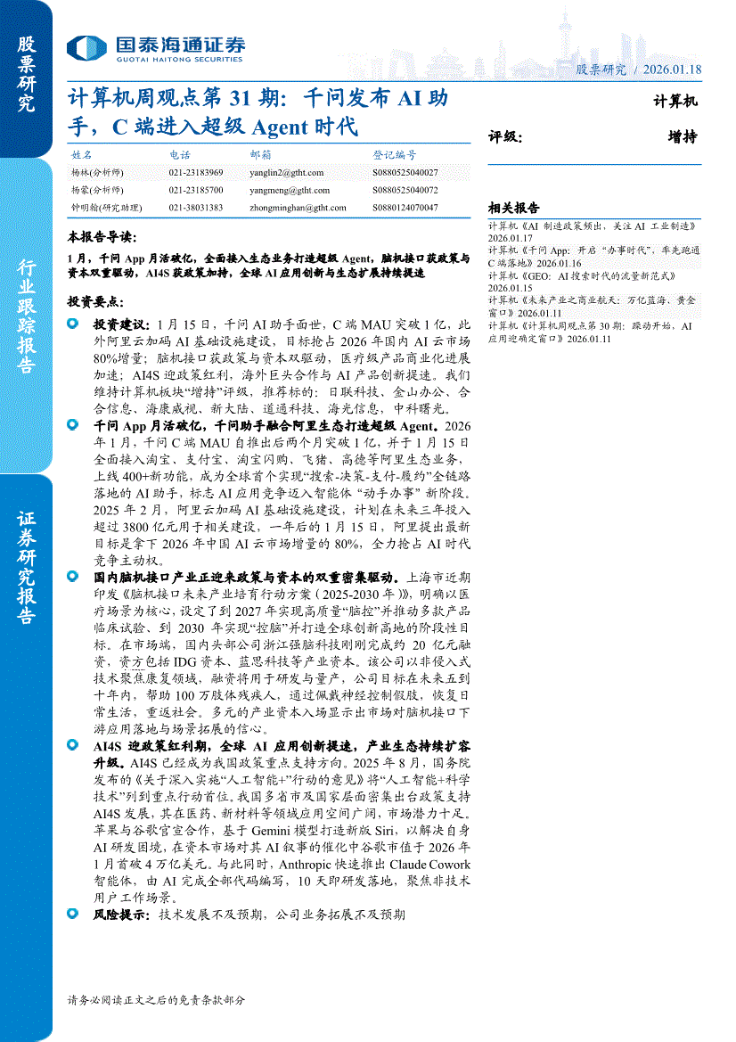 计算机行业:国泰海通证券-计算机行业周观点第31期:千问发布AI助手,C端进入超级Agent时代-260118