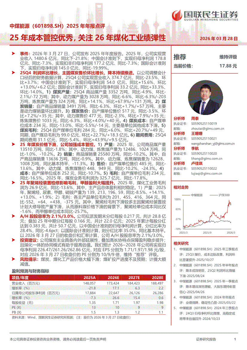 中煤能源:国联民生证券-中煤能源-601898-2025年年报点评:25年成本管控优秀,关注26年煤化工业绩弹性-260328