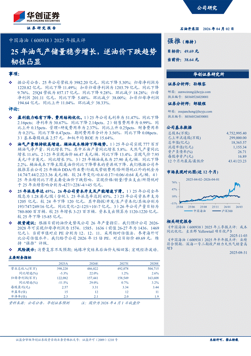 中国海油:华创证券-中国海油-600938-2025年报点评:25年油气产储量稳步增长,逆油价下跌趋势韧性凸显-260402