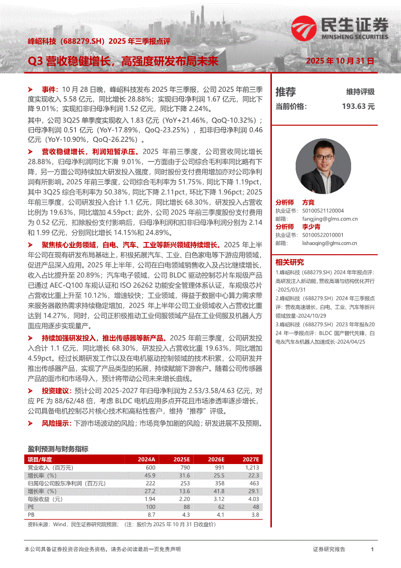 峰岹科技:民生证券-峰岹科技-688279-2025年三季报点评:Q3营收稳健增长,高强度研发布局未来-251031