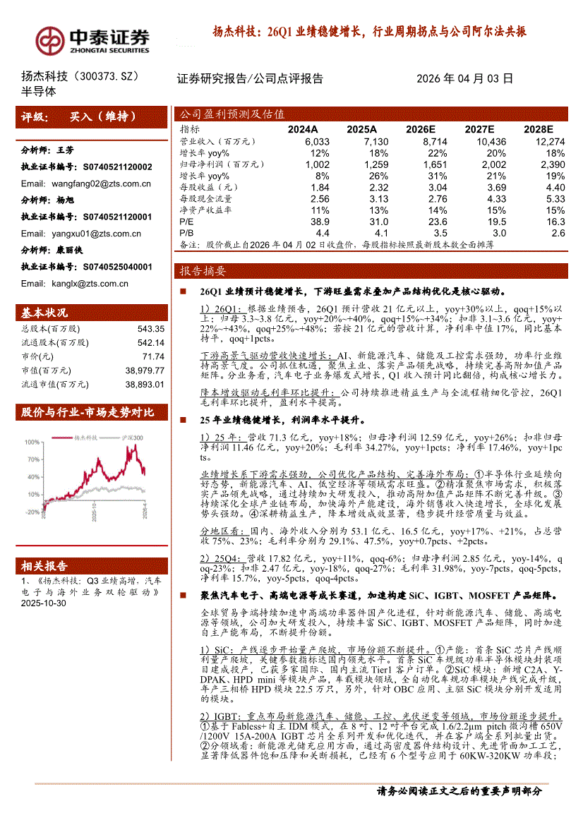 扬杰科技:中泰证券-扬杰科技-300373-26Q1业绩稳健增长,行业周期拐点与公司阿尔法共振-260403