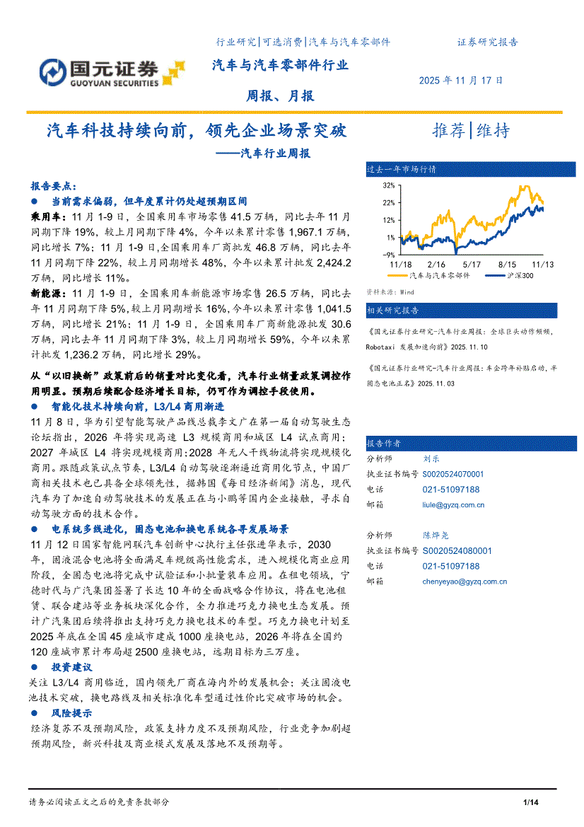 汽车行业:国元证券-汽车行业周报:汽车科技持续向前,领先企业场景突破-251117