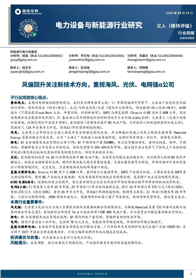 电力设备与新能源行业:国金证券-电力设备与新能源行业周报:风偏回升关注新技术方向,重视海风、光伏、电网强α公司-260419