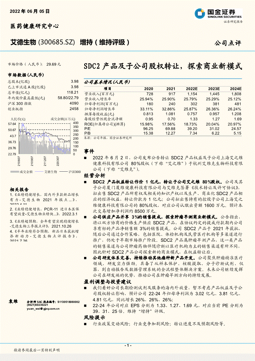 艾德生物:国金证券-艾德生物-300685-SDC2产品及子公司股权转让,探索商业新模式-220605