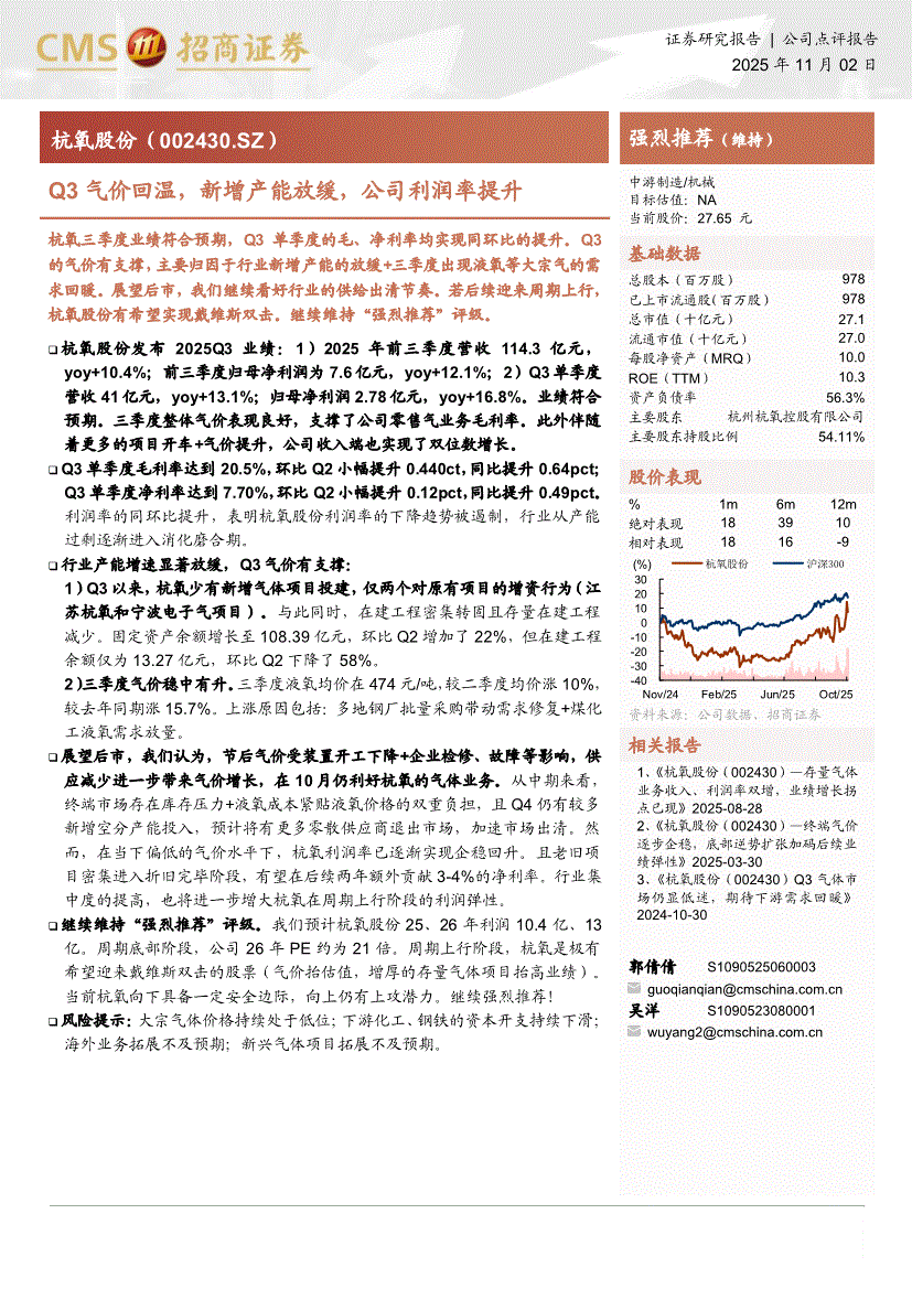杭氧股份:招商证券-杭氧股份-002430-Q3气价回温,新增产能放缓,公司利润率提升-251102