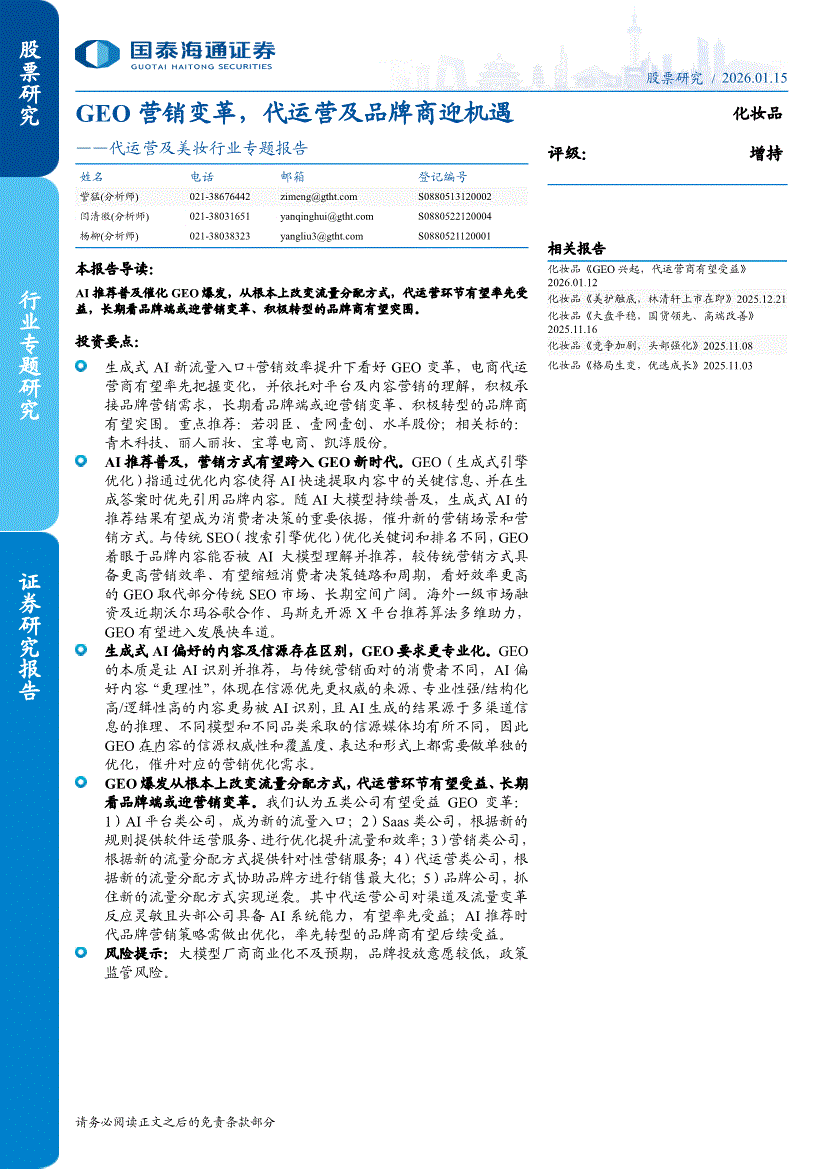 代运营及美妆行业:国泰海通证券-代运营及美妆行业专题报告:GEO营销变革,代运营及品牌商迎机遇-260115