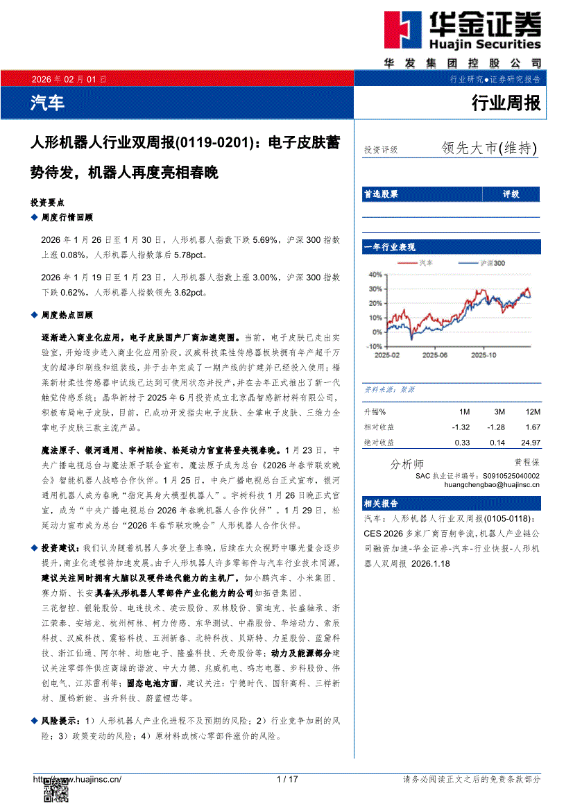 人形机器人行业:华金证券-人形机器人行业双周报:电子皮肤蓄势待发,机器人再度亮相春晚-260201