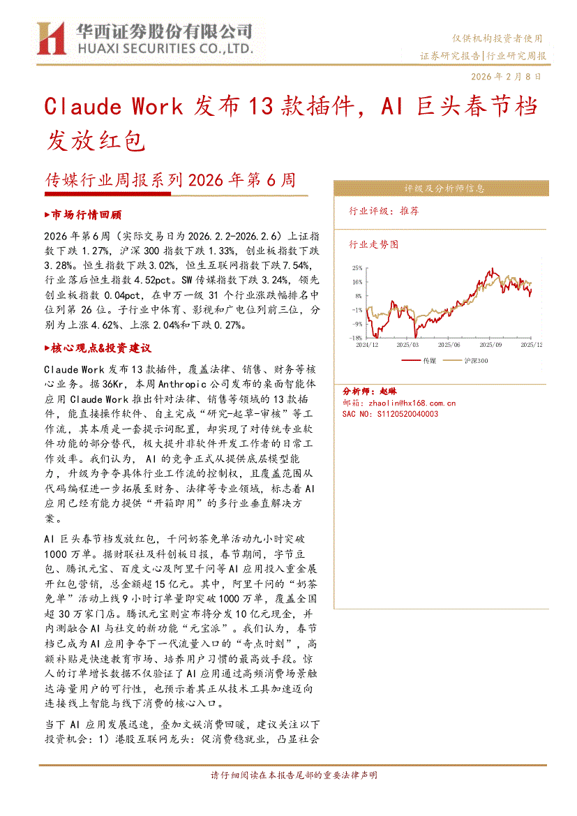 传媒行业:华西证券-传媒行业周报系列2026年第6周:Claude Work发布13款插件,AI巨头春节档发放红包-260208