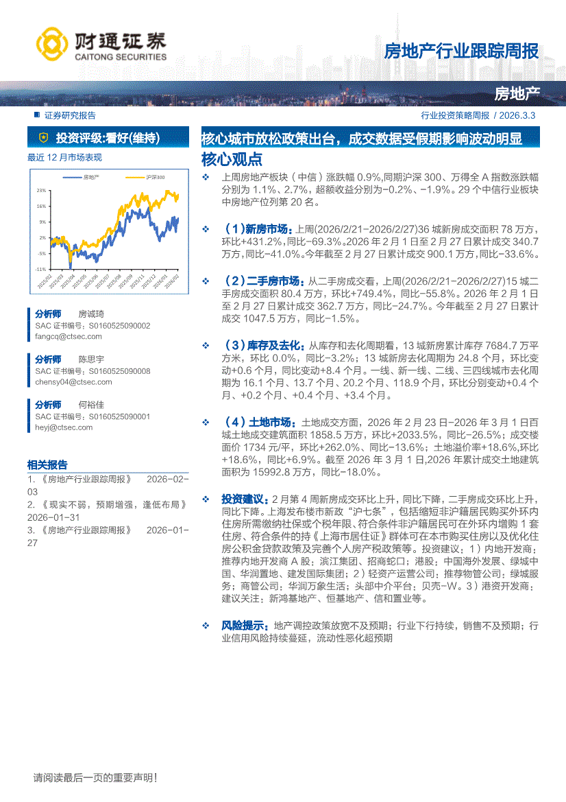 房地产行业:财通证券-房地产行业跟踪周报:核心城市放松政策出台,成交数据受假期影响波动明显-260303