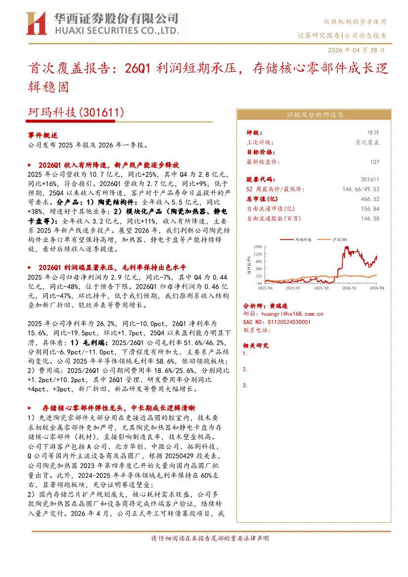 珂玛科技:华西证券-珂玛科技-301611-首次覆盖报告:26Q1利润短期承压,存储核心零部件成长逻辑稳固-260428