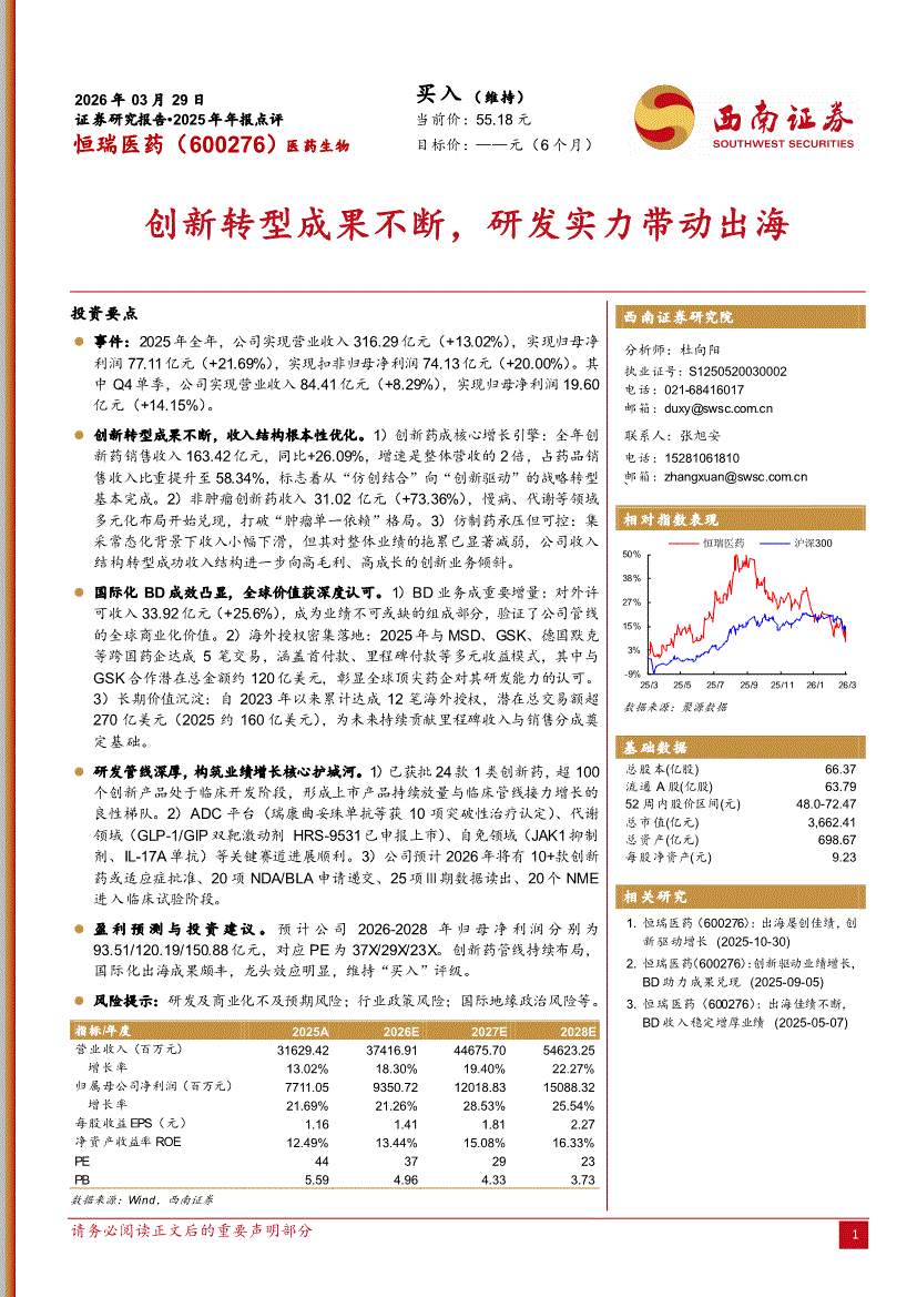 恒瑞医药:西南证券-恒瑞医药-600276-创新转型成果不断,研发实力带动出海-260329