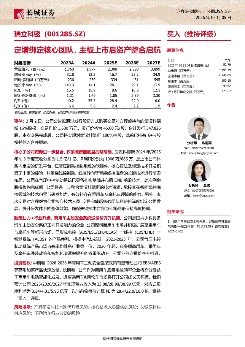 瑞立科密:长城证券-瑞立科密-001285-定增绑定核心团队,主板上市后资产整合启航-260305