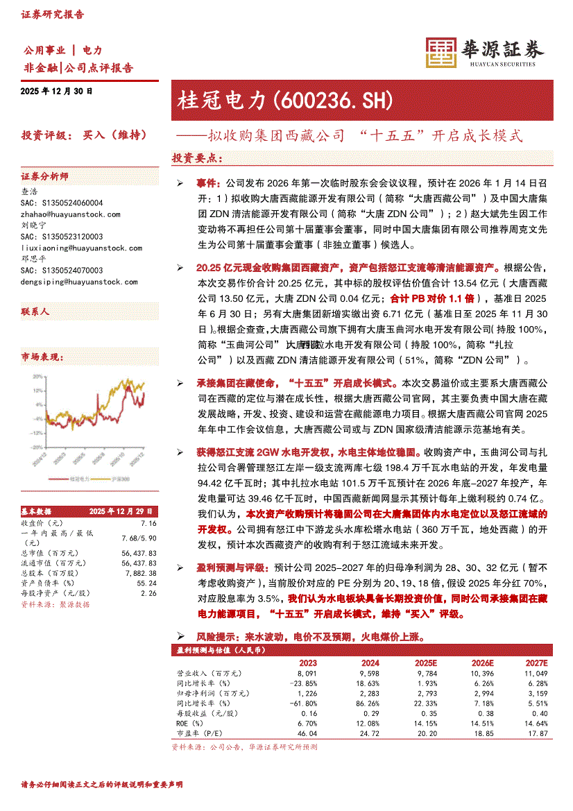 桂冠电力:华源证券-桂冠电力-600236-拟收购集团西藏公司,“十五五”开启成长模式-251230