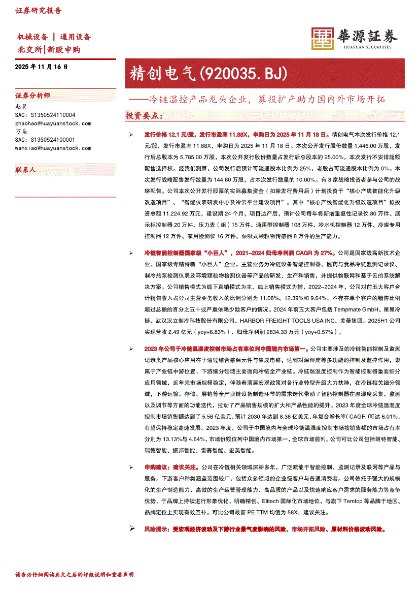 精创电气:华源证券-精创电气-920035-冷链温控产品龙头企业,募投扩产助力国内外市场开拓-251116