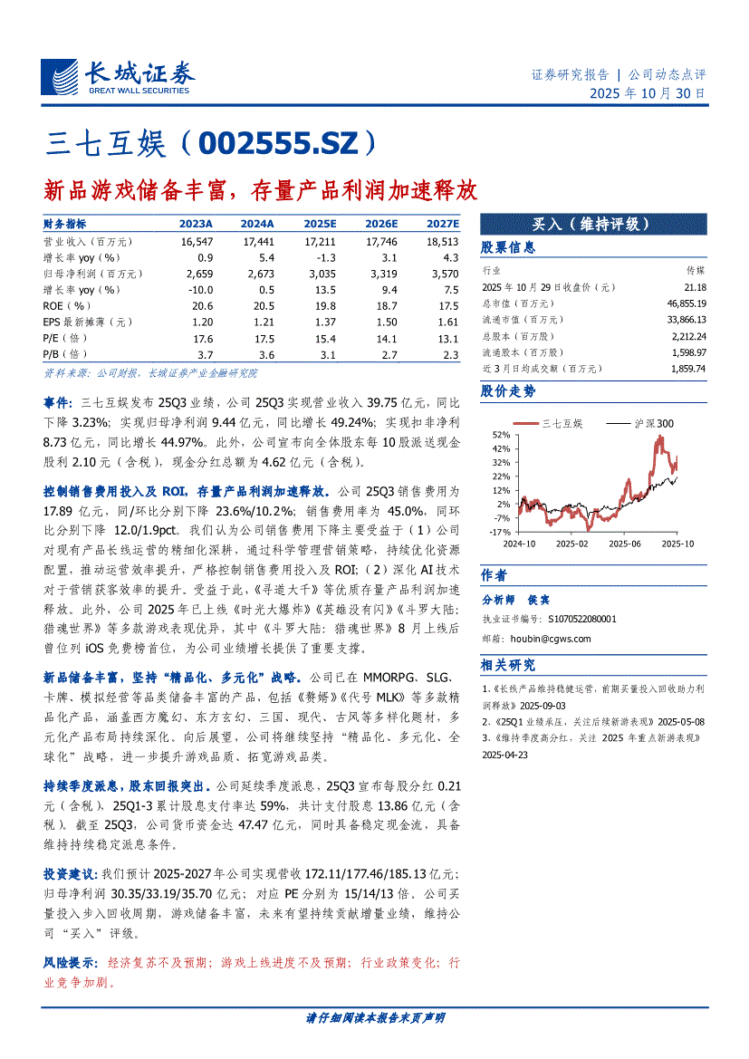 三七互娱:长城证券-三七互娱-002555-新品游戏储备丰富,存量产品利润加速释放-251030