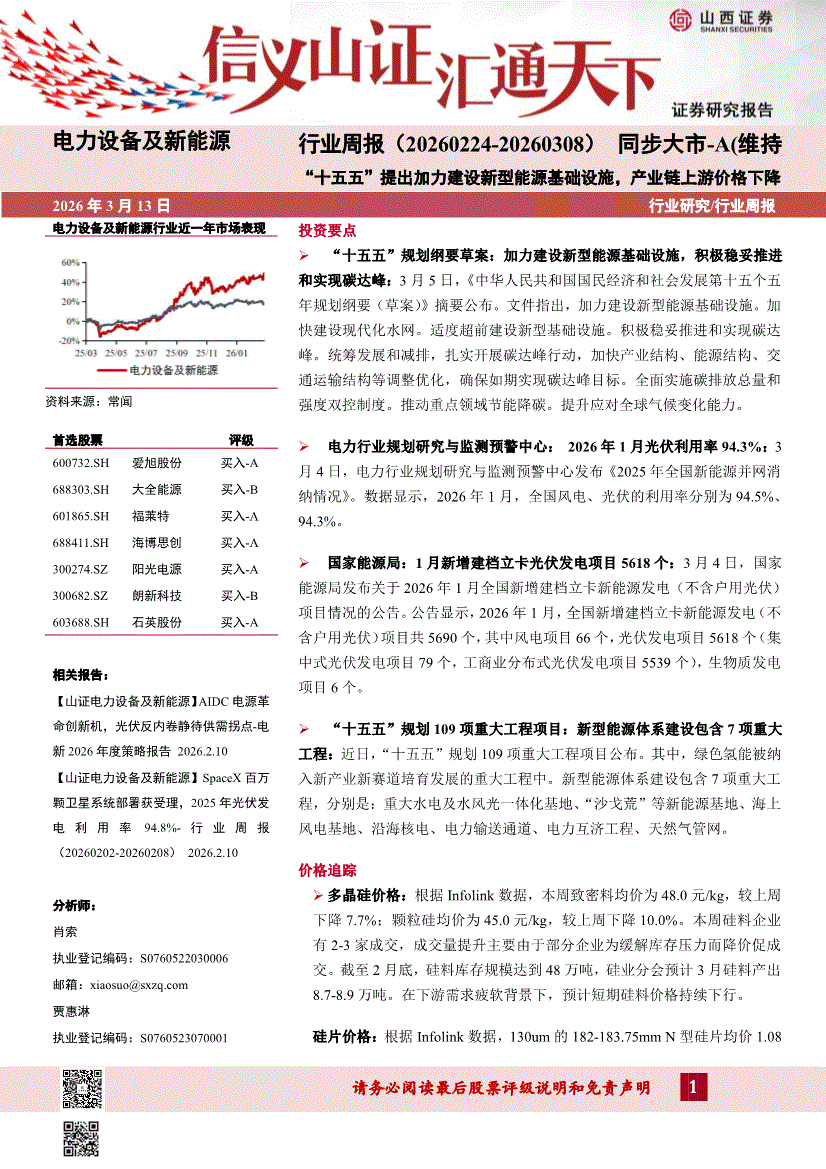 电力设备及新能源行业:山西证券-电力设备及新能源行业周报:“十五五”提出加力建设新型能源基础设施,产业链上游价格下降-260313