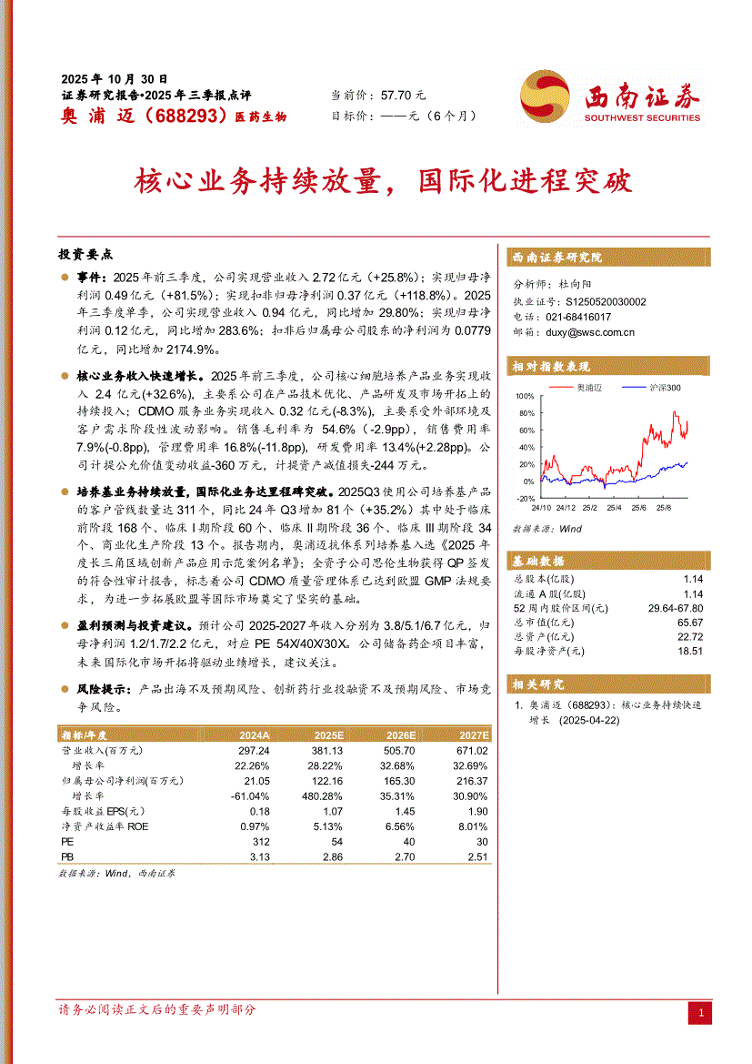 奥浦迈:西南证券-奥浦迈-688293-核心业务持续放量,国际化进程突破-251030