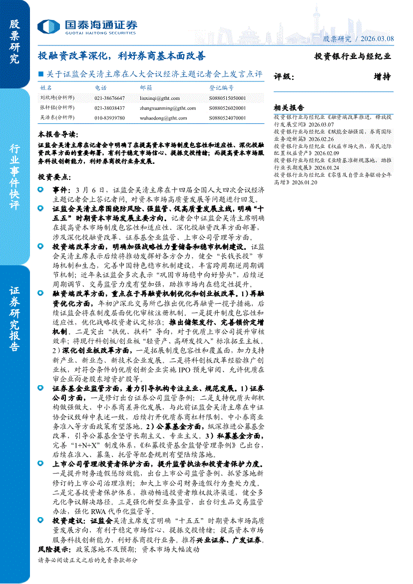 投资银行业与经纪业行业:国泰海通证券-投资银行业与经纪业行业关于证监会吴清主席在人大会议经济主题记者会上发言点评:投融资改革深化,利好券商基本面改善-260308