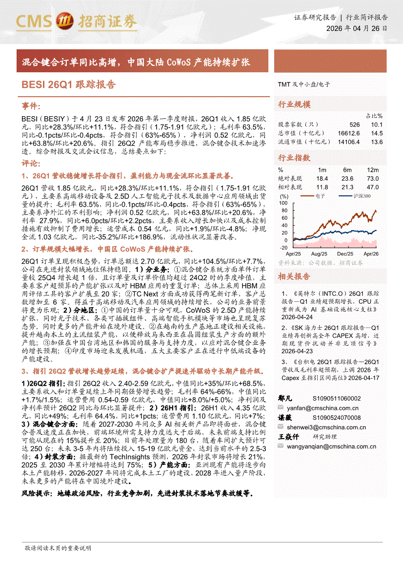 电子行业:招商证券-电子行业BESI26Q1跟踪报告:混合键合订单同比高增,中国大陆CoWoS产能持续扩张-260426