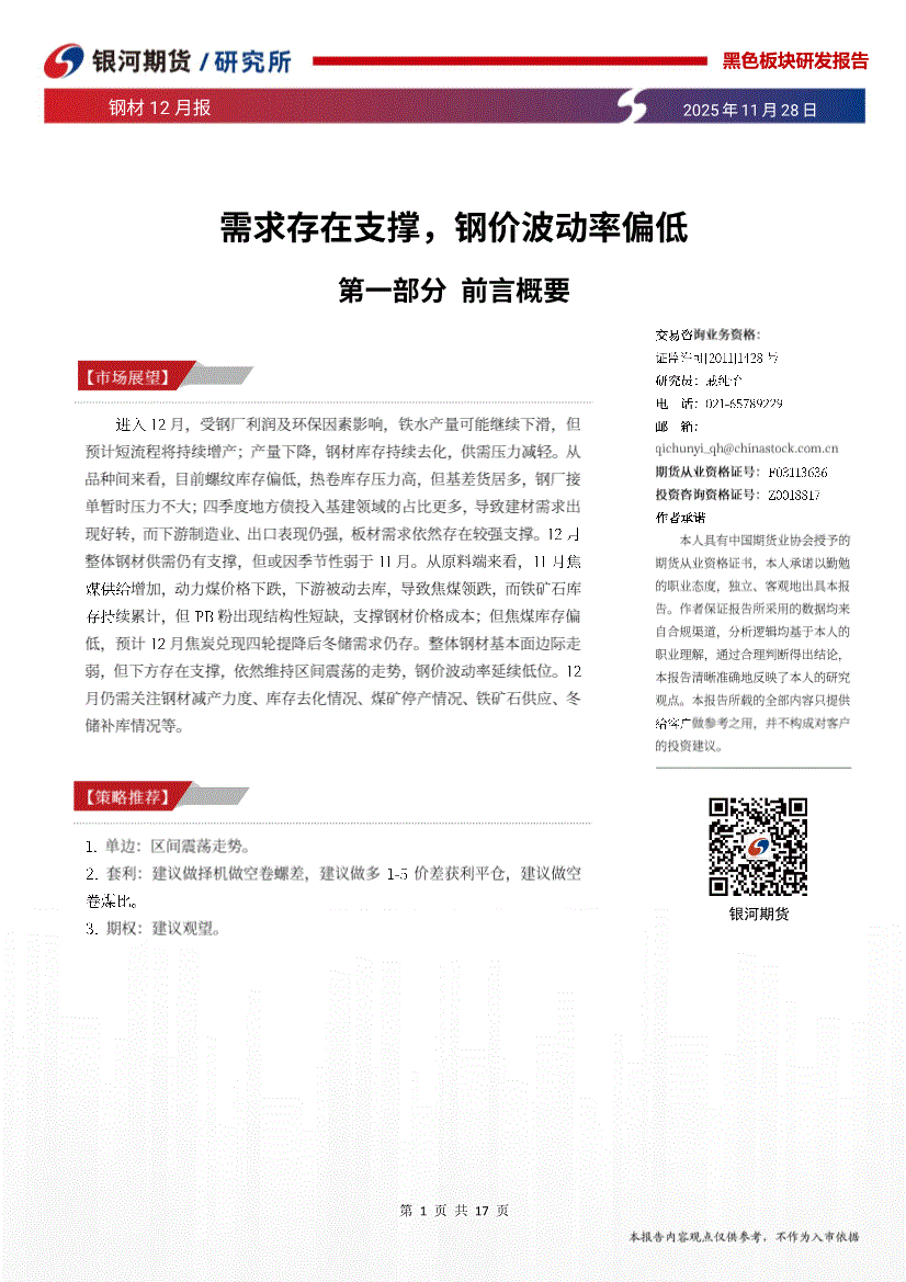 银河期货-钢材12月报:需求存在支撑,钢价波动率偏低-251128
