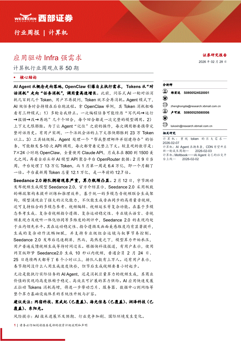 计算机行业:西部证券-计算机行业周观点第50期:应用驱动Infra强需求-260228