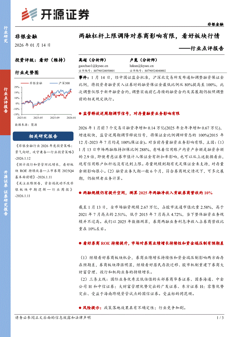 非银金融行业:开源证券-非银金融行业点评报告:两融杠杆上限调降对券商影响有限,看好板块行情-260114