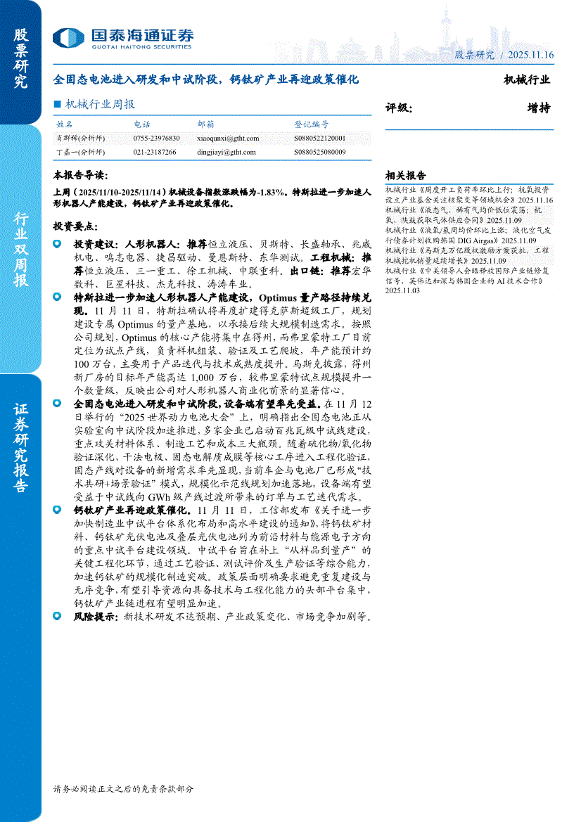 机械行业:国泰海通证券-机械行业周报:全固态电池进入研发和中试阶段,钙钛矿产业再迎政策催化-251116