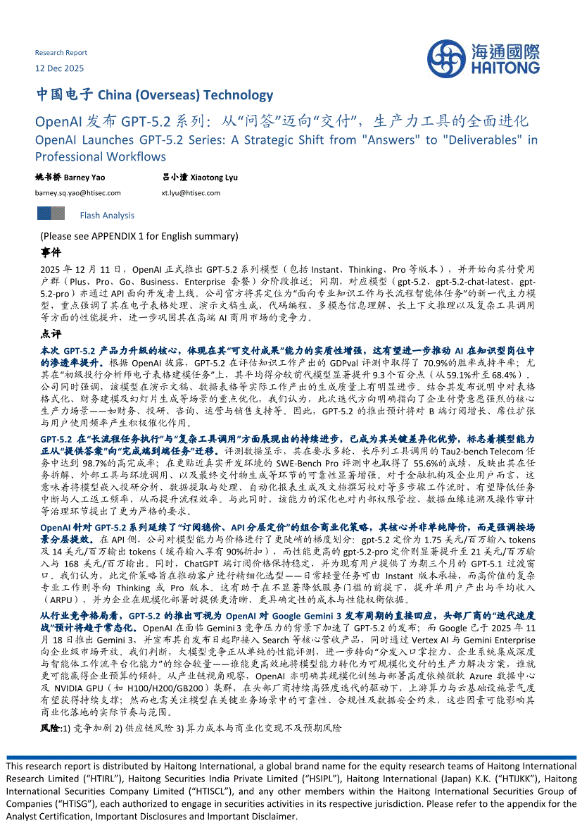 电子行业:海通国际-中国电子行业OpenAI发布GPT~5.2系列:从“问答”迈向“交付”,生产力工具的全面进化-251212