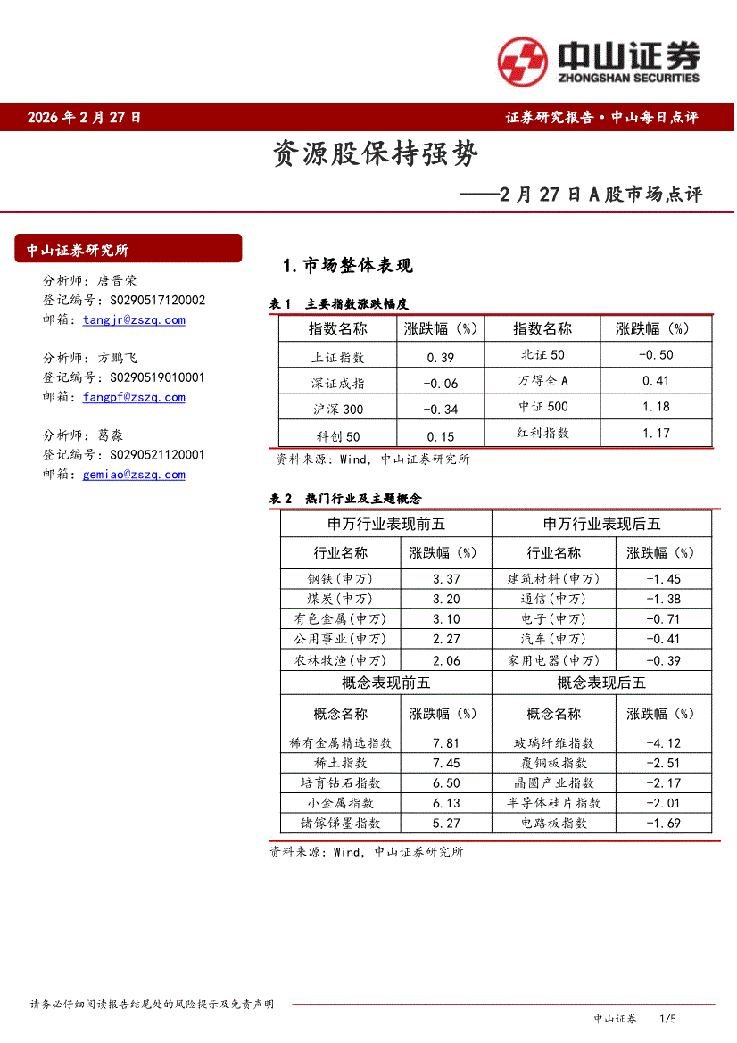 中山证券-A股市场点评:资源股保持强势-260227