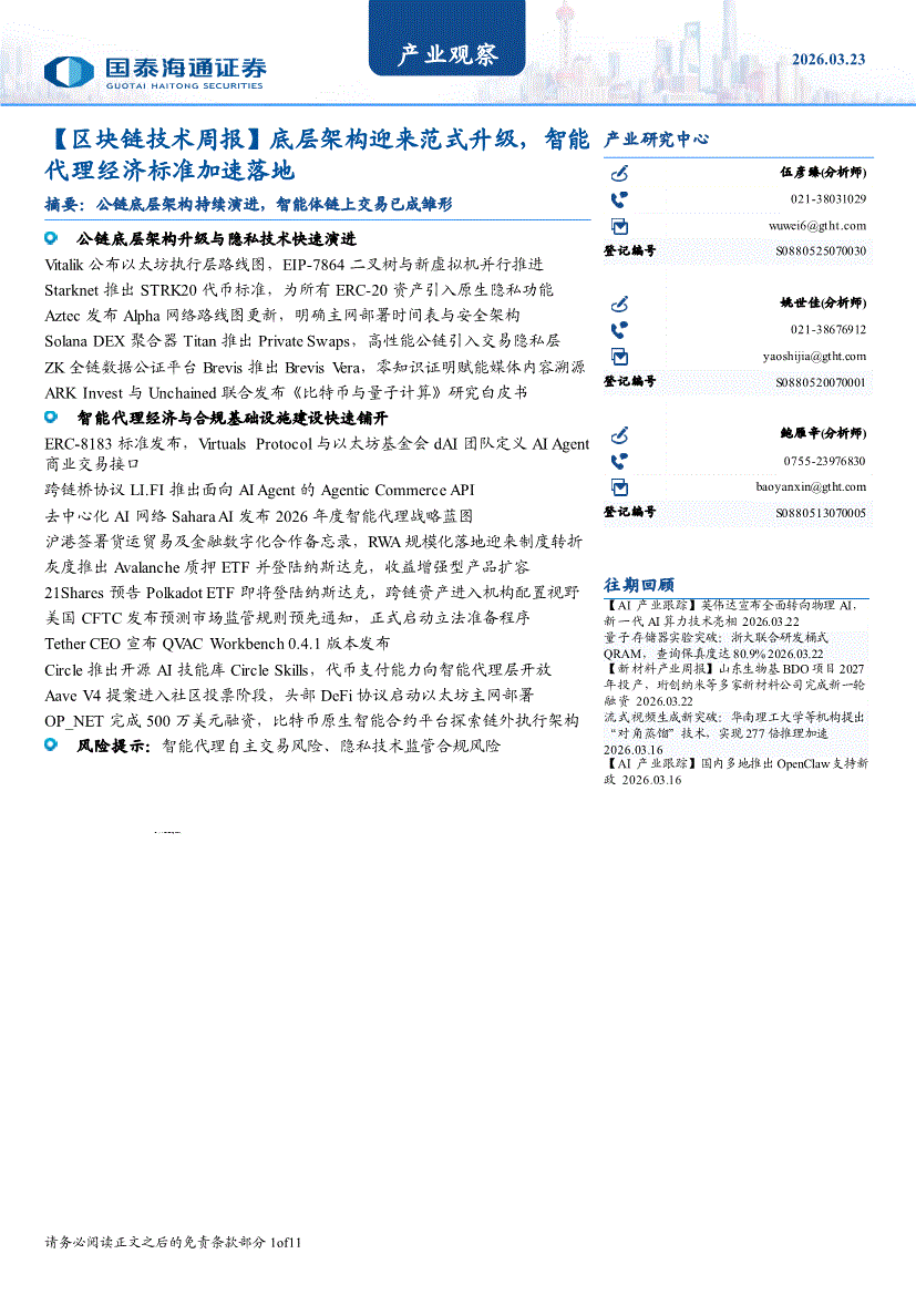 国泰海通证券-产业观察:【区块链技术周报】底层架构迎来范式升级,智能代理经济标准加速落地-260323