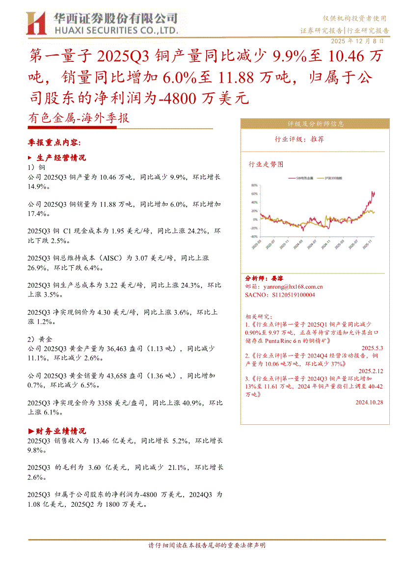 有色金属行业:华西证券-有色金属行业~海外季报:第一量子2025Q3铜产量同比减少9.9%至10.46万吨,销量同比增加6.0%至11.88万吨,归属于公司股东的净利润为~4800万美元-251208