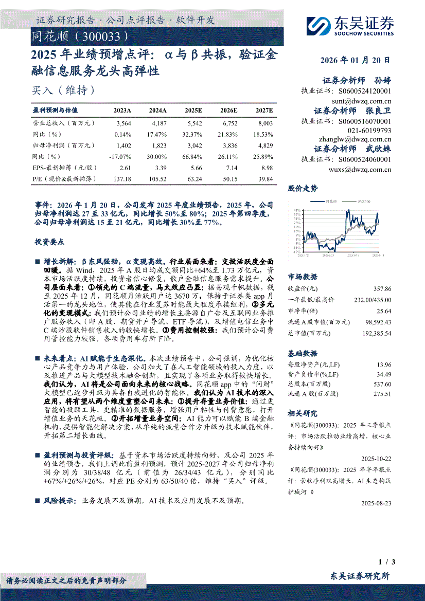 同花顺:东吴证券-同花顺-300033-2025年业绩预增点评:α与β共振,验证金融信息服务龙头高弹性-260120