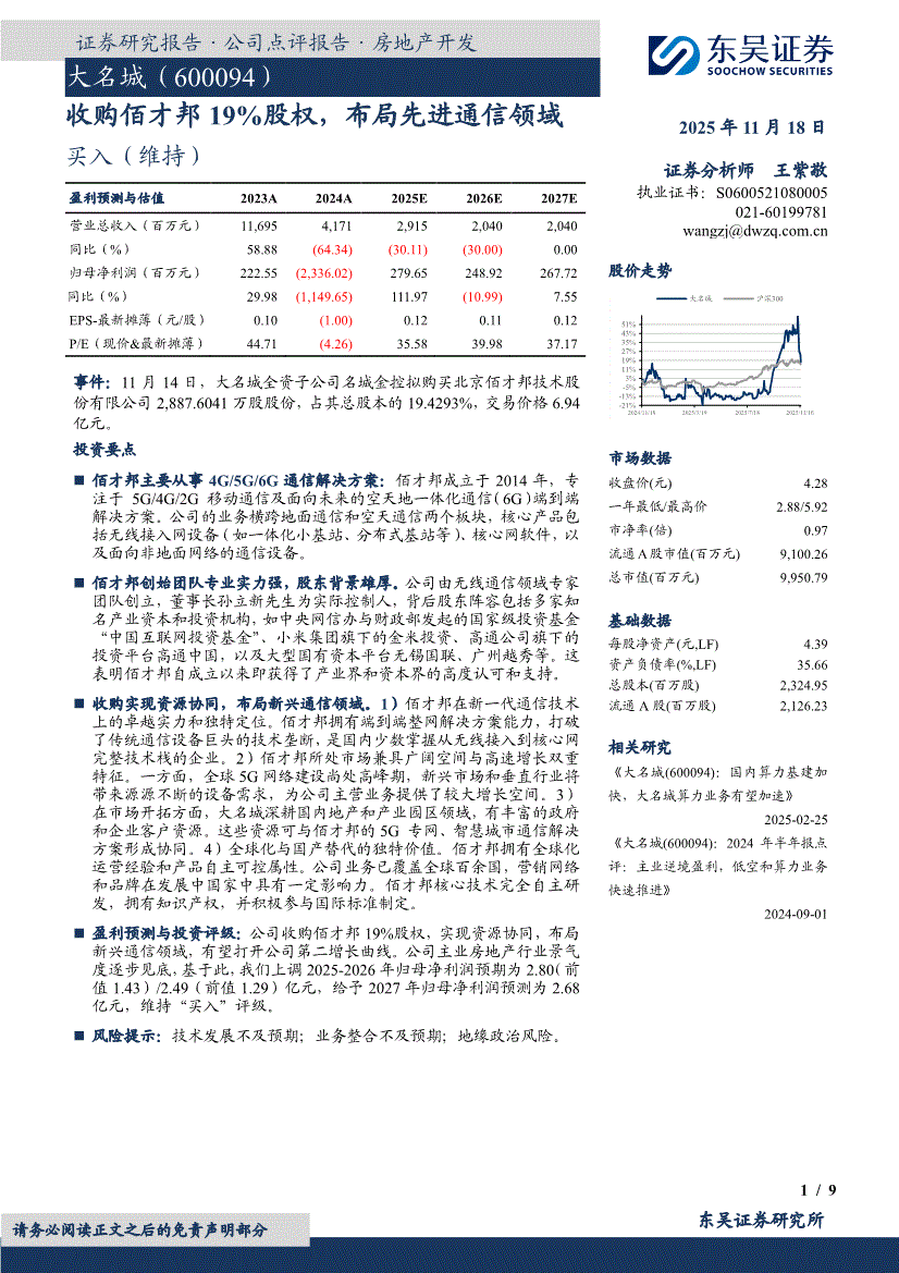 大名城:东吴证券-大名城-600094-收购佰才邦19%股权,布局先进通信领域-251118